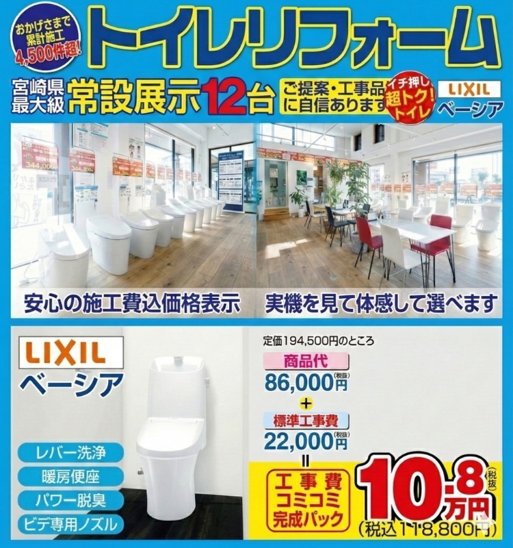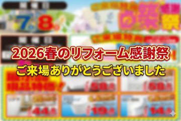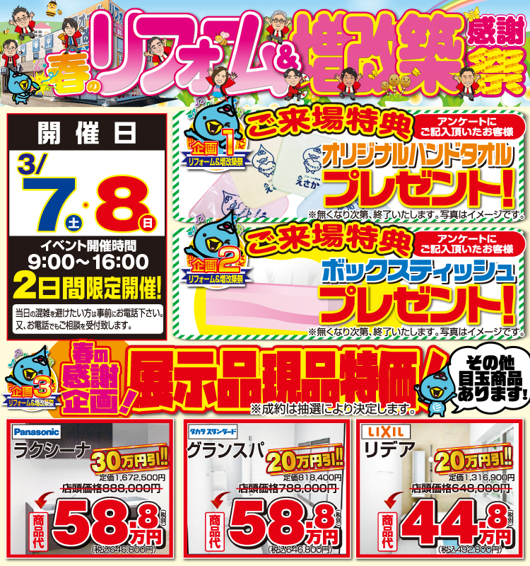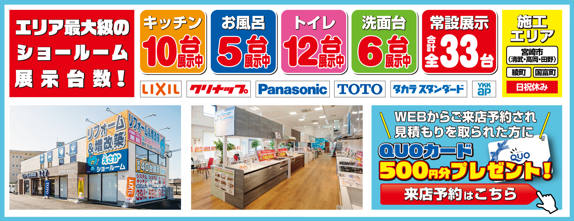 \えさかで工事して頂いたお客様へ/ 冬の大感謝祭 3日間開催! 2/6(金)2/7(土)2/8(日) 開催時間 9:00~16:00 DMは工事して頂いたお客様のご自宅に 1~2週間前に郵送されます 一般のお客様も来店可能です! 日頃の感謝の気持ちを込めまして、寒さを吹き飛ばす「冬の大感謝祭」を開催いたします。 ご家族やご友人様とお誘い合わせの上、ぜひお気軽に遊びにいらしてください。 事前予約をする .call-button { background-color: #2656D6; /* 添付ボタンに近いブルー */ color: #FFFFFF; /* 白文字 */ font-size: 1.25rem; /* テキストを大きめに */ font-weight: bold; /* 太字 */ padding: 1rem 2rem; /* 上下1rem、左右2rem */ border: none; /* 枠線なし */ border-radius: 1.5rem; /* 角丸 */ cursor: pointer; /* ホバーでポインタ */ display: inline-block; /* レイアウト用 */ text-align: center; } .call-button:active { opacity: 0.8; /* 押したときの視覚フィードバック */ } ご招待状をお持ちの方限定! ありがとうの豪華3大特典! DM(ご招待状)をお持ちの上ご来場いただいたお客様に、感謝の気持ちを込めて素敵な特典をご用意いたしました。 【ご来場特典①】日用品キッチン4点セット プレゼント! 毎日使える便利なキッチン用品のセットです。 (※ご家族様1セット限り) 【ご来場特典②】感謝の気持ち トイレットロール プレゼント! 「ありがとう」の気持ちを込めて。実用的なトイレットロールです。 (※ご家族様2個限り) 【ご来場特典③】佐土原産 キュウリと佐土原なすプレゼント! 新鮮!地元の味覚。佐土原産キュウリ&伝統野菜「佐土原なす」 天候や収穫状況により、内容は予告なく変更となる場合がございます。 生鮮食品ですので、お早めにお召し上がりください。 (※ご家族様1箱限り) ※特典の写真はイメージです。数に限りがございますので、なくなり次第終了とさせていただきます。 ※ご来場の際は、本状(DMご招待状)を忘れずにお持ちください。 \お楽しみ大抽選会!/ 豪華景品が当たる、ハズレなしの大抽選会も開催します! 【1等】宮崎県産 お米 3kg(15名様) その他、皆様に喜んでいただける素敵な景品を多数ご用意しております。何が当たるかは当日のお楽しみ! 【お得意様限定】展示品破格! リフォーム応援値引きの2大特典 今回は特に、日頃お世話になっているお得意様へ向けた「展示品現品特価」と「リフォーム応援お値引き」の2大特典をご用意いたしました。 ▼ 目玉企画:展示品現品が驚きの大特価! ショールーム展示品入れ替えのため、憧れの高級設備を現品限りの特別価格でご提供します。 Panasonic ラクシーナ(キッチン) 定価より大幅ダウン、なんと30万円お値引き! 商品代:58.8万円(税別) タカラスタンダード グランスパ(お風呂) こちらも20万円お値引きのチャンス。 商品代:58.8万円(税別) LIXIL リデア(お風呂) 20万円お値引きで、まさかの40万円台。 商品代:44.8万円(税別) ▼ メーカー問わず!リフォーム商品代お値引き 上記 特価品も対象でWでお得です!! 展示品以外でも、対象工事であればメーカーを問わずお値引きいたします。 5万円引き:システムキッチン、ユニットバス 2万円引き:エコキュート 1万円引き:トイレ、洗面台、内窓リフォーム 【期間・条件】 当日ご来場の上、現地調査・お見積りを経て2月28日(土)までにご成約いただいたお客様に限ります。 一点限りの商品もございますので、ぜひお早めにご相談ください。皆様のご来場を心よりお待ちしております。 ★当日のご予約も大歓迎です!★ 事前予約をしていただいた方には、過去にお客様のリフォームを担当させていただいた営業担当が直接お迎えさせていただきます。 思い出話に花を咲かせながら、今後のリフォームプランについてもお話しできれば幸いです。 ※本イベントは、これまで工事をして頂いたお客様への感謝祭ですが、リフォームにご興味のある一般のお客様も大歓迎です!お気軽にご来場ください。 イベント速報 【春のリフォーム感謝祭】 3/7(土)~3/8(日) .feedback-button { background: linear-gradient(to bottom, red, yellow); color: white; font-size: 1.2em; font-weight: bold; padding: 20px; text-align: center; text-decoration: none; display: block; border-radius: 5px; width: 100%; max-width: 300px; margin: 20px auto; box-shadow: 0 4px 6px rgba(0, 0, 0, 0.1); } あなたの声を聞かせてください! グーグルクチコミを投稿する .banner { text-align: center; font-family: Arial, sans-serif; } .reserve-banner { background-color: #4CAF50; padding: 20px; color: white; border-radius: 10px; margin: 20px 0; } .reserve-banner a { display: inline-block; background-color: #4CAF50; color: white; padding: 20px 40px; text-decoration: none; border-radius: 5px; font-weight: bold; font-size: 28px; } .reserve-banner a:hover { background-color: #45a049; } .contact-banner { background-color: #005bb5; padding: 20px; color: white; border-radius: 10px; } .contact-banner a { color: white; font-size: 28px; text-decoration: none; display: block; padding: 20px 40px; background-color: #005bb5; border-radius: 5px; font-weight: bold; } .contact-banner a:hover { background-color: #004b9a; } \ショールームへ行く/ \当日予約もOK/ 事前予約をする .call-button { background-color: #2656D6; /* 添付ボタンに近いブルー */ color: #FFFFFF; /* 白文字 */ font-siz