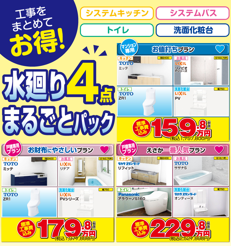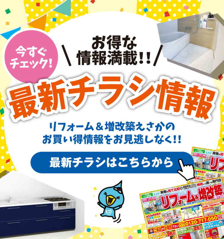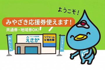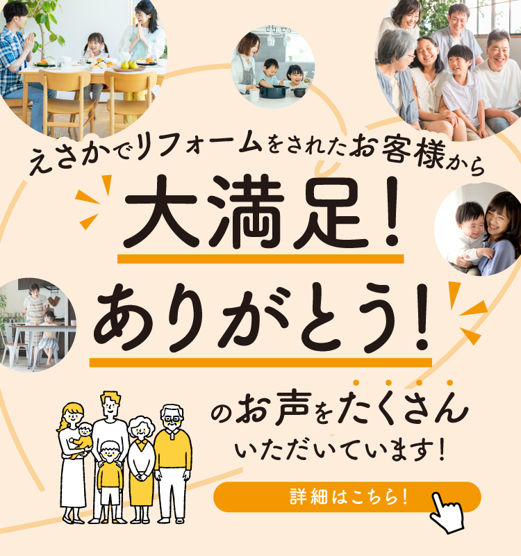 \2026春のリフォーム感謝祭/ 予約なしでも来場OK! 【2日間限定開催】 3/7(土)8(日)9:00~16:00 臨時駐車場 JA宮崎中央宮崎統括支店↙MAP 日頃よりえさかショ-ル-ムをご利用いただき、 誠にありがとうございます。 皆さまへの感謝の気持ちをこめて、 春のリフォーム感謝祭を開催致します。 \感謝祭チラシをチェック/ .web-check-button { background-color: red; color: white; font-size: 1.5em; font-weight: bold; padding: 15px 25px; text-align: center; text-decoration: none; display: inline-block; border-radius: 5px; width: 100%; max-width: 300px; box-shadow: 0 4px 6px rgba(0, 0, 0, 0.1); } チラシをCHECK! 【対応エリア:宮崎市・国富町・綾町】 \感謝祭に参加する/ 予約して頂けるとスムーズにご案内ができますのでお勧めです .banner { text-align: center; font-family: Arial, sans-serif; } .reserve-banner { background-color: #4CAF50; padding: 20px; color: white; border-radius: 10px; margin: 20px 0; } .reserve-banner a { display: inline-block; background-color: #4CAF50; color: white; padding: 20px 40px; text-decoration: none; border-radius: 5px; font-weight: bold; font-size: 28px; } .reserve-banner a:hover { background-color: #45a049; } .contact-banner { background-color: #005bb5; padding: 20px; color: white; border-radius: 10px; } .contact-banner a { color: white; font-size: 28px; text-decoration: none; display: block; padding: 20px 40px; background-color: #005bb5; border-radius: 5px; font-weight: bold; } .contact-banner a:hover { background-color: #004b9a; } 事前予約をする ご来場・ご成約特典 \ご来場&アンケートご記入で/ 何枚あっても重宝する えさかっぱタオルハンカチ & ボックスティシュプレゼント(生活雑貨) ※無くなり次第終了いたします 【感謝祭限定!】 憧れのリフォームが奇跡の価格で! 【抽選方式】展示品大特価:各限定1台限り 事前見学で実物(向き:サイズ感)を ご確認いただくことをおすすめします サイズが合えば運命の出会い 「シンデレラ・フィット」を探せ! ショールーム展示品の一斉放出。 「サイズ」や「向き」さえ合えば、最高グレードの商品が驚きの価格で手に入ります。 事前見学で実物確認もOK。各限定1台の抽選販売です。このチャンスをお見逃しなく! 【 キ ッ チ ン 】 料理のしやすさを考え抜いた機能美 ①Pnasonic ラクシーナ 通常店頭価格 888,000円を 30万円引!! 特別価格 588,000円(税別) (税込 646,800円) 【 お風呂 】 お手入れ簡単、美しさが続くホーロー品質。 ②タカラスタンダード グランスパ 通常店頭価格 788,000円を 20万円引!! 特別価格 588,000円(税別) (税込 646,800円) ライフスタイルに合わせた快適バスルーム。 ③LIXIL リデア 通常店頭価格 648,000円を 20万円引!! 特別価格 448,000円(税別) (税込 492,800円) 【 ト イ レ 】 泡で洗う、全自動おそうじトイレ。 ④Panasonic アラウーノL150 通常店頭価格 262,000円を 6.4万円引!! 特別価格 198,000円(税別) (税込 217,800円) 安心のTOTO 使いやすさとデザインが魅力。 ⑤TOTO GG1-800 通常店頭価格 186,000円を 3.8万円引!! 特別価格 148,000円(税別) (税込 162,800円) ※お申し込みはイベント期間中にご来店頂き 希望商品をお申し込み下さい。 3月末までにご契約いただいた方のみ対象となります ※工事費別途 お風呂45万円(税別)・キッチン26万円(税別) トイレ2.2万円(税別)かかります 【春イベント限定で賢くお得な改修を】 断熱改修でお得に快適リノベキャンペーン 2026年も補助金活用にあたり、複数の工事・断熱改修が必須条件となり、一層の住宅の省エネ性能向上が求められる時代が到来しました! リフォーム&増改築えさかでは、イベント限定の先進的窓リノベを中心とした「住宅省エネ2025応援!断熱改修でお得に快適リノベキャンペーン」を実施中です!これを機に、快適でお得な住まいづくりを始めてみませんか? 【イベント限定キャンペーン】 ●内窓(大小問わず)1セットにつき ▶5,000円引き! ●勝手口ドア(カバー工法)1セットにつき ▶10,000円引き! ●玄関ドア(カバー工法)1セットにつき ▶ 20,000円引き! ▶YKK AP玄関ドア +成約特典30,000円引き! 合わせて50,000円引き こんな方におすすめ ・冬は暖かく、夏は涼しい快適な住まいを目指したい方 ・光熱費を抑えながら環境にも配慮したい方 ・国の補助金制度を活用してお得にリフォームしたい方 断熱性能を高めることで、冷暖房効率が向上し、光熱費の削減にもつながります。 また、「先進的窓リノベ2026事業」を活用すれば、高性能な断熱窓やドアへの改修工事費用の最大50%が補助されます。内窓設置や外窓交換だけでなく、玄関ドアの断熱改修も対象となるため、効率的に住まい全体の断熱性能を向上できます。最大100万円の補助金が受けられる可能性があり、まとめてお得に窓・玄関リフォームが可能です。 水回りリフォーム4点 まるごとパックがオススメ! 水廻りの交換時期、来ていませんか? リフォームは個別に行うよりも「まとめて」が断然お得です! 当店では工事費コミコミの安心価格で、建物タイプ(戸建・マンション)に合わせた3つの特選プランをご用意しました。 「水廻り4点まるごとパック」とは? キッチン・お風呂・トイレ・洗面化粧台の4点設備と、「標準工事費」をセットにした明