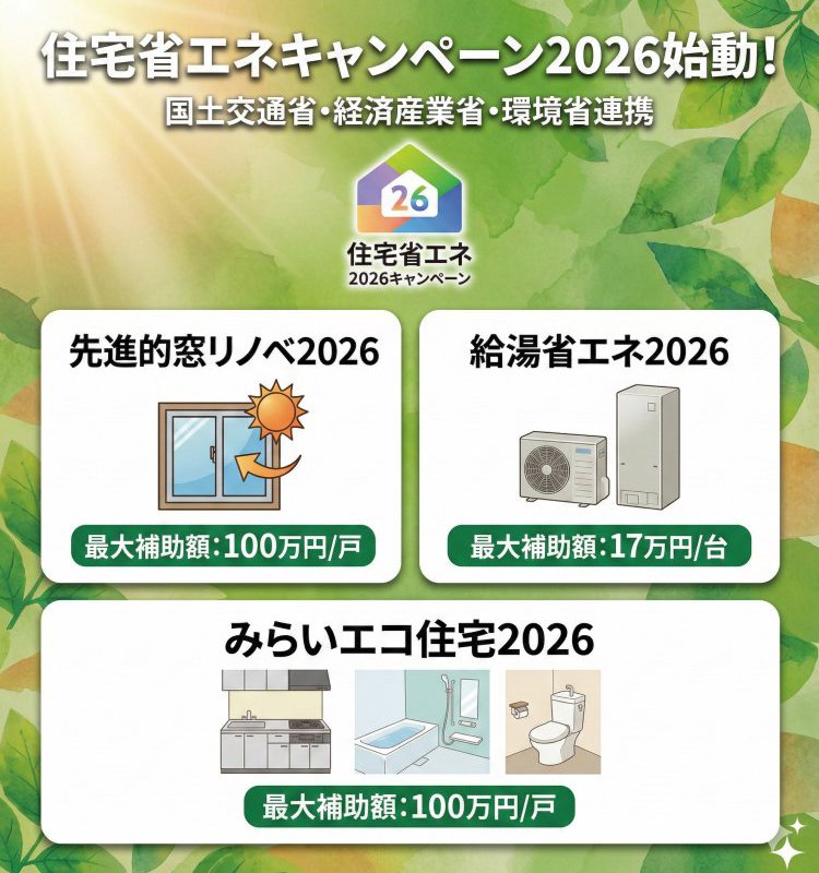 \リフォーム&増改築えさか/ 1-3月限定 チラシ/イベント情報 住宅省エネキャンペーン2026始動! 4月値上げ!LIXIL商品は今のご注文がお得! \お得な情報をチェック/ .web-check-button { background-color: red; color: white; font-size: 1.5em; font-weight: bold; padding: 15px 25px; text-align: center; text-decoration: none; display: inline-block; border-radius: 5px; width: 100%; max-width: 300px; box-shadow: 0 4px 6px rgba(0, 0, 0, 0.1); } WEBチラシをCHECK! 【対応エリア:宮崎市・国富町・綾町】 .web-check-button { background-color: red; color: white; font-size: 1.5em; font-weight: bold; padding: 15px 25px; text-align: center; text-decoration: none; display: inline-block; border-radius: 5px; width: 100%; max-width: 300px; box-shadow: 0 4px 6px rgba(0, 0, 0, 0.1); } 給湯専門チラシをCHECK! 日頃よりえさかショールームをご愛顧いただき、心から感謝申し上げます。 リフォーム&増改築えさかでは、寒さを乗り越え、暖かな春の訪れを迎えるための特別プランをご用意しております。新しい年と共に、お家のリフォームを検討されてはいかがでしょうか。↙CLICK 冬におすすめのリフォームプラン↙CLICK 寒さ対策・省エネ効果抜群の断熱リフォーム 冬の冷え込みを和らげ、省エネ効果もアップ!光熱費を抑えながら快適な空間へ。 家族が集うリビングの模様替え↙CLICK 皆が集い、心温まるリビングづくりをご提案します。 キッチンの機能性アッププラン↙CLICK お料理がもっと楽しく快適に!最新設備で日々の家事がラクラクに。 寒さ対策や省エネ効果を高める断熱リフォーム、家族が集うリビングの模様替え、キッチンの機能性アップなど、春の訪れと共に、皆様の理想の住空間を実現するため、誠心誠意お手伝いさせていただきます。 \ショールームへ行く/ \当日予約もOK/ .banner { text-align: center; font-family: Arial, sans-serif; } .reserve-banner { background-color: #4CAF50; padding: 20px; color: white; border-radius: 10px; margin: 20px 0; } .reserve-banner a { display: inline-block; background-color: #4CAF50; color: white; padding: 20px 40px; text-decoration: none; border-radius: 5px; font-weight: bold; font-size: 28px; } .reserve-banner a:hover { background-color: #45a049; } .contact-banner { background-color: #005bb5; padding: 20px; color: white; border-radius: 10px; } .contact-banner a { color: white; font-size: 28px; text-decoration: none; display: block; padding: 20px 40px; background-color: #005bb5; border-radius: 5px; font-weight: bold; } .contact-banner a:hover { background-color: #004b9a; } 来店予約 【対応エリア:宮崎市・国富町・綾町】 リフォームの疑問や不安、直接プロに相談しませんか? 気軽に相談する \\LINEかんたん問い合わせ// チ売り 休館日カレンダー 【イベント速報!!】 【OB様感謝祭】 2/6(金)~2/8(日) 【春のリフォーム感謝祭】 3/7(土)~3/8(日) 2026年春がリフォームのベストタイミング 補助金:住宅省エネ2026キャンペーン始動! 賢い活用術で最大補助額をゲット! 過去最大級のリフォーム支援策「住宅省エネ2026キャンペーン」が実施されます。 注目は、2025年11月28日以降の着工分も対象となる見込みである点。新年度を待たず、今すぐ計画するのが最もお得です。 特に冬の寒さや光熱費にお悩みなら「内窓」がおすすめ。 断熱効果で冷暖房効率が劇的に向上し、一年中快適な住環境を実現します。 さらに給湯器交換や、セットで行う水回り・バリアフリー改修も対象となる画期的な制度です。 補助額は窓リノベで最大100万円、総額200万円超の活用チャンスも。 過去には早期終了した例もあるため、予算のある今のうちに早めの行動をお勧めします。まずは無料見積もりからご相談ください。 .web-check-button { background-color: red; color: white; font-size: 1.5em; font-weight: bold; padding: 15px 25px; text-align: center; text-decoration: none; display: inline-block; border-radius: 5px; width: 100%; max-width: 300px; box-shadow: 0 4px 6px rgba(0, 0, 0, 0.1); } 補助金について相談する 2026年のリフォームは「窓」から。 家計と健康を守る「先進的窓リノベ」活用術 住宅の熱の出入りの約6~7割は、実は「窓」などの開口部から発生しています。 そのため窓の断熱改修は、夏の暑さや冬の寒さ、結露を劇的に改善し、光熱費削減に最も即効性があります。 2026年事業では、高性能な窓やドアへの交換に1戸最大100万円の補助金が交付されます。 春のリフォームに向け、年明け早めの計画が成功の鍵です。 他補助金との併用で支援額を最大化する提案も可能です。複雑な申請は私たちが代行しますので、ぜひ快適な住まいへの更新をご検討ください。 最大17万円補助!光熱費を賢く抑える 「給湯省エネ2026」始動& 新ブランド「え~湯」誕生のお知らせ 家計消費の3割を占める「給湯」。冬の光熱費対策は今が好機です! ■「給湯省エネ2026事業」始動 高効率給湯器への交換に最大17万円の補助金が支給されます。 エコキュート:最大10万円 エネファーム:最大17万円 (※古い電気温水器の撤去加算を含むと+2万円) 今回の特徴は「昼間沸き上げシフト(DR機能)」の導入。次世代の給湯スタイルで、賢く家計負担を減らしましょう。 ■専門ブランド「え~湯」誕生 本事業に合わせ、新ブランド「え~湯」がデビュー。 給湯器のお悩み