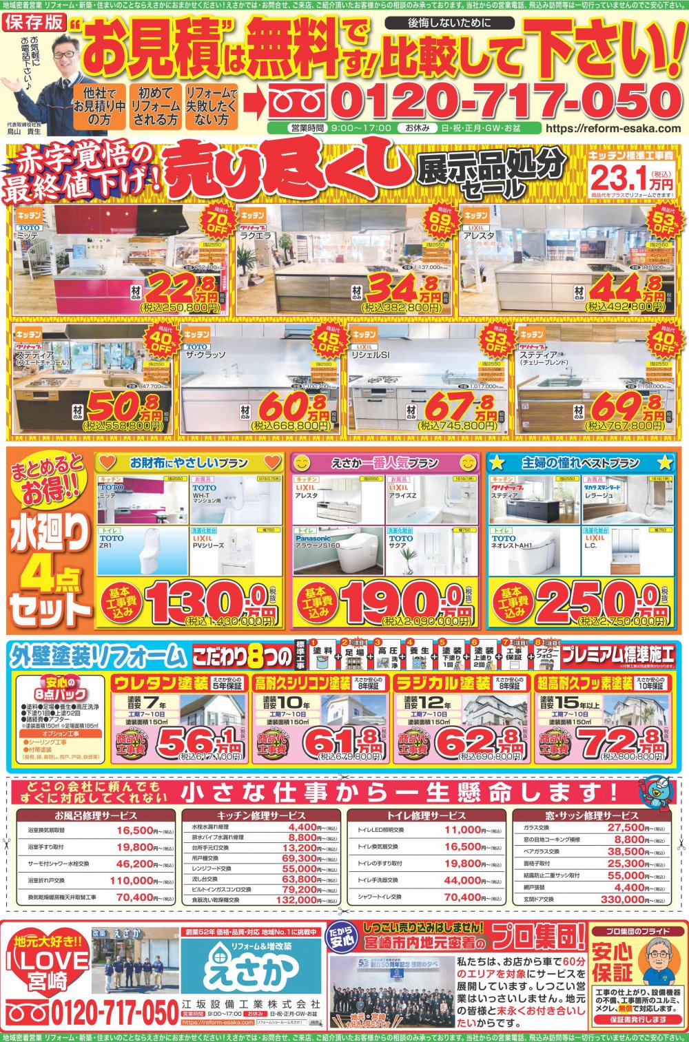 受付時間 / 9:00~17:00 (12:00-13:00 電話休止)施工対応:宮崎市/綾町/国富町