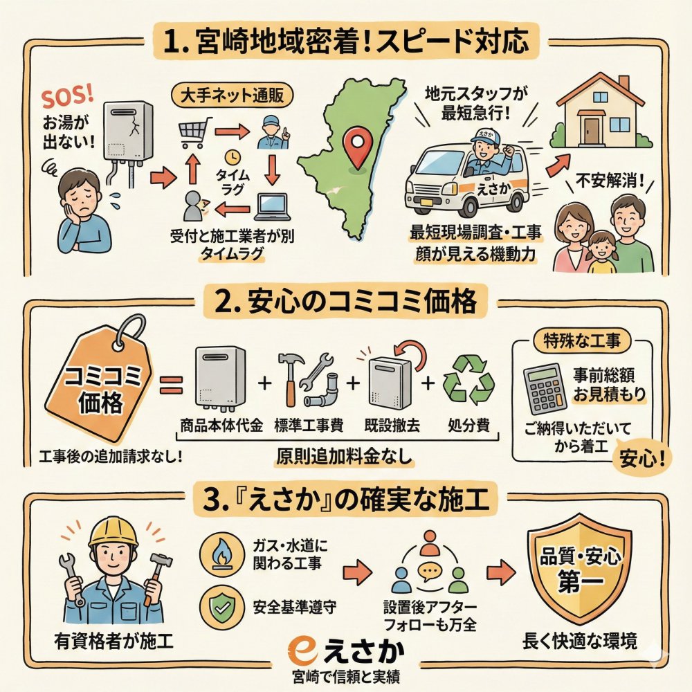 宮崎市で給湯器の交換をご検討の方は、ぜひ専門店「えさか」にご相談ください。
