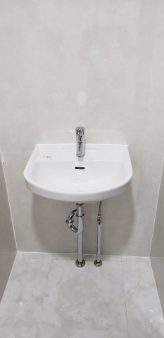 トイレに入ると「明るく、とても眩いが」第一印象だったそうです。全てが白基調なので清潔感があり、お客様にも満足して頂き、良かったと思います。 狭いスペースでも、白(明るい)色になると広く感じる事が、改めて確認できました。私たちも今後のアドバイスに役立てたいと思います。