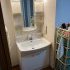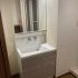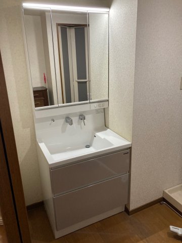 現場を確認したところ床材の表面は少し黒ずんでいましたが芯は問題なくしっかりしていましたので洗面化粧台の取替でご案内しました。