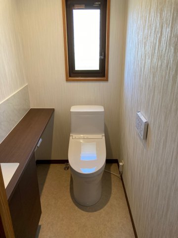 トイレも手洗いカウンター付きの商品を採用しインテリアや小物も置けて落ち着いた空間となりました。