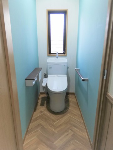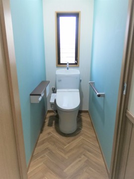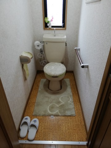 トイレの取替を機会に、クロスとクッションフロアも張替えて可愛いトイレ空間になりました。紙巻き器を手摺兼用タイプにしたので将来も安心ですね。