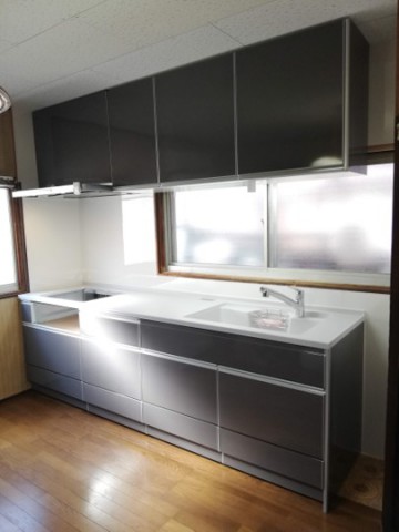 新しいキッチンもキャビネットはホーロー、天板とシンクは人工大理石一体型でお手入れしやすいキッチンです。