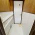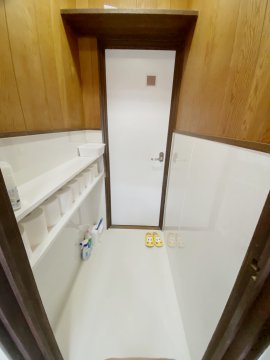 小便器や手洗器があったスペースには棚を造作し、トイレットペーパー等を置けるようにしました。また、不具合のあったトイレのドアを内装に合わせて白い扉に作り替えました。