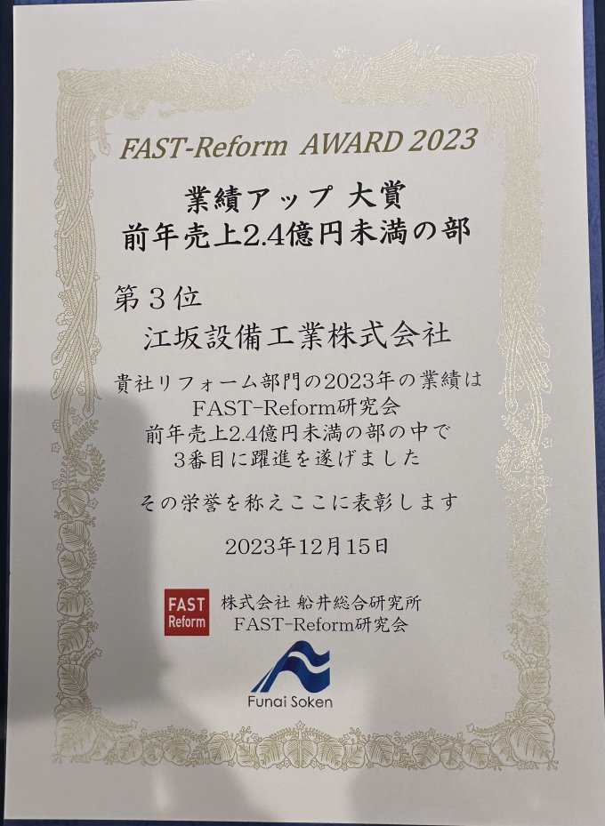 オープンから4年目を迎えた今、お客様やスタッフ、パートナー企業様との協力により、このような名誉ある賞を受賞することができました。心より感謝申し上げます。今後とも、「リフォーム&増改築えさか」を何卒よろしくお願い申し上げます。