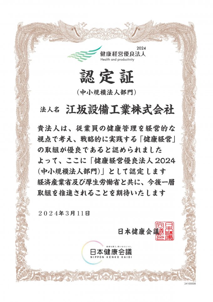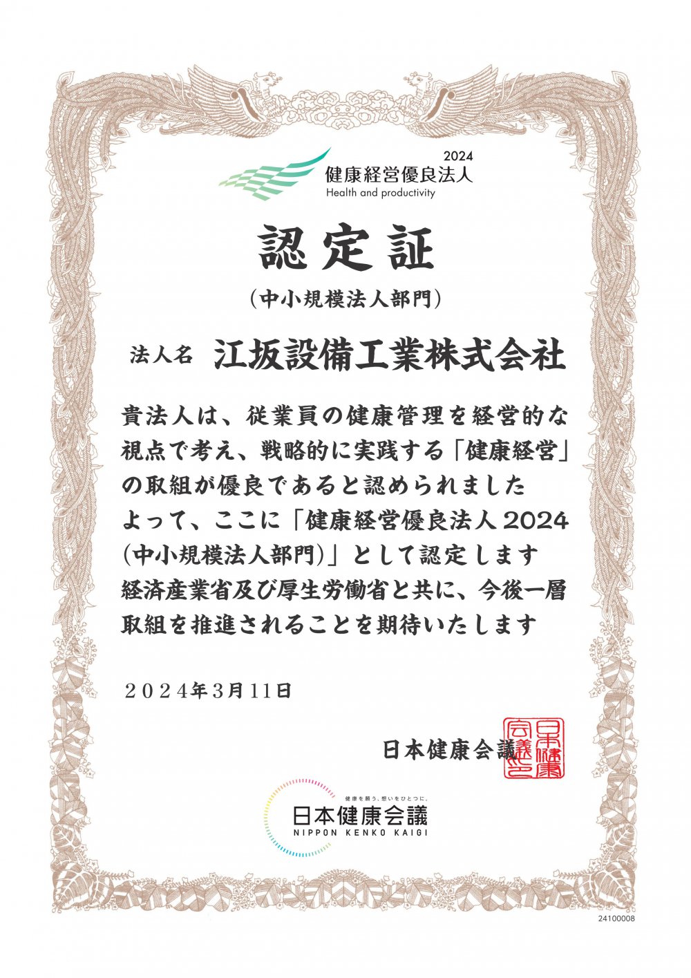 2024年3月11日付けで、経済産業省および日本健康会議が共同で優良な健康経営を実践している法人を認定する「健康経営優良法人2024(中小規模法人部門)」に選定されました。(宮崎県認定99社 建設32社)