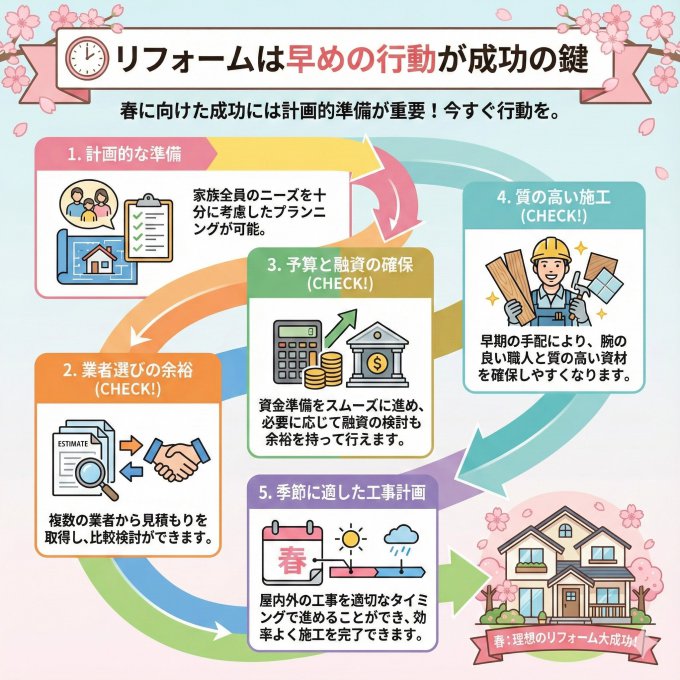 春に向けたリフォームを成功させるためには、計画的な準備が何よりも重要です。