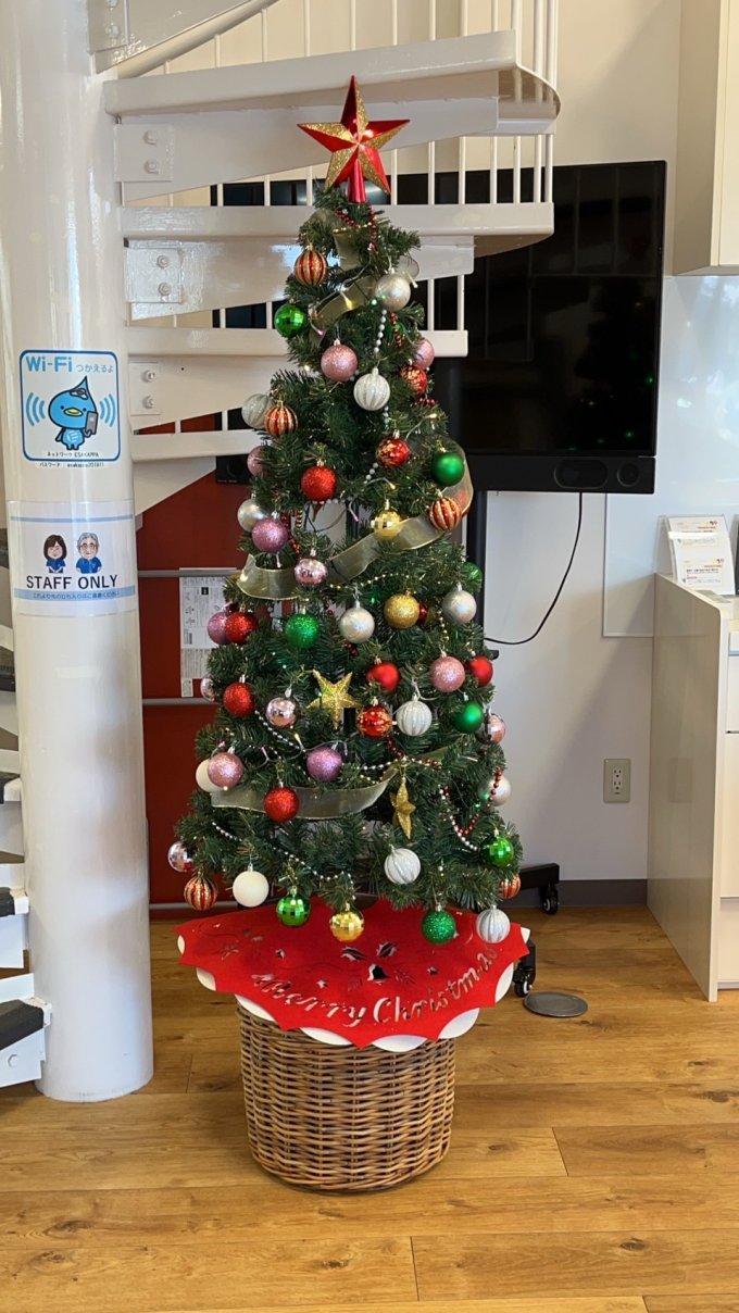 イベント感のあるオーナメントやリース、大小のツリーが所々に配置されており、温かな冬の雰囲気を演出しています。