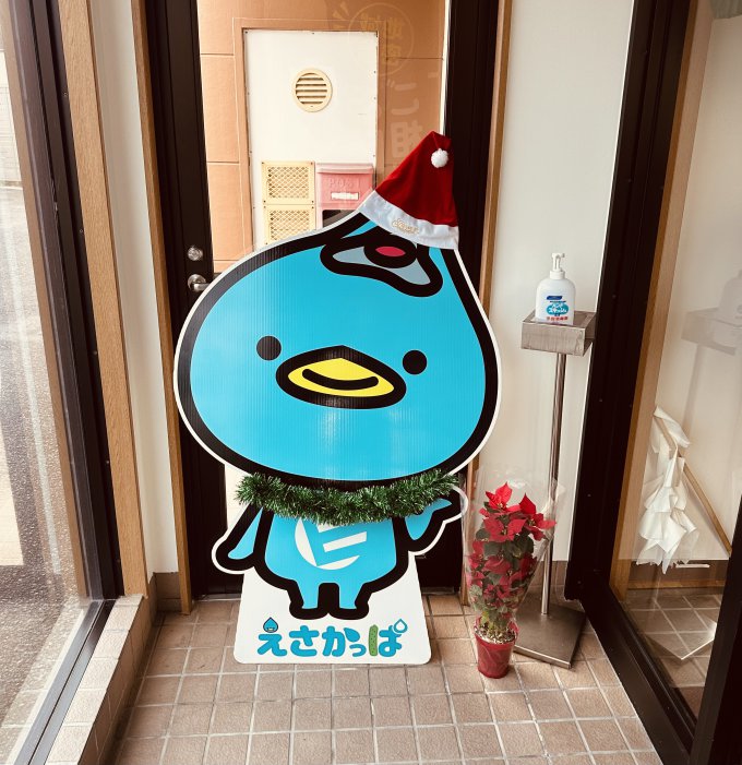 笑顔を誘う、えさかっぱのクリスマスバージョン まず、皆様をお出迎えするのは、入口に飾られたクリスマスリースとかわいいサンタ帽を被ったえさかっぱです。