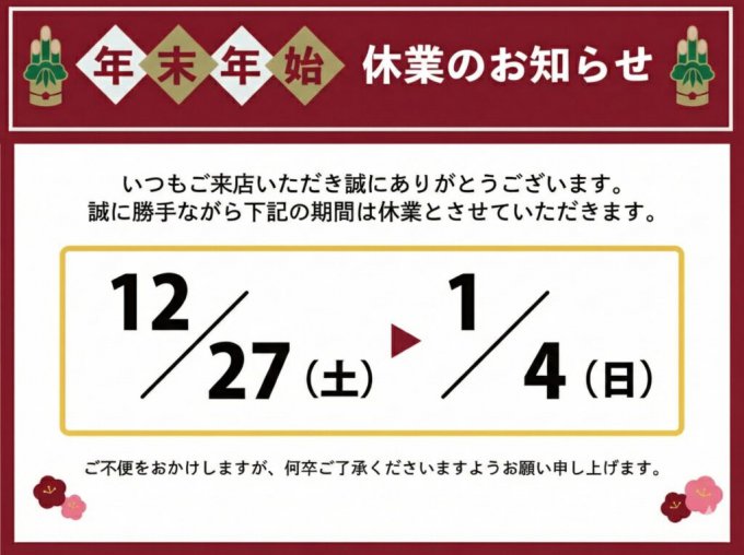 【仕事始め1/5(月)~】年末年始 休業のお知らせ