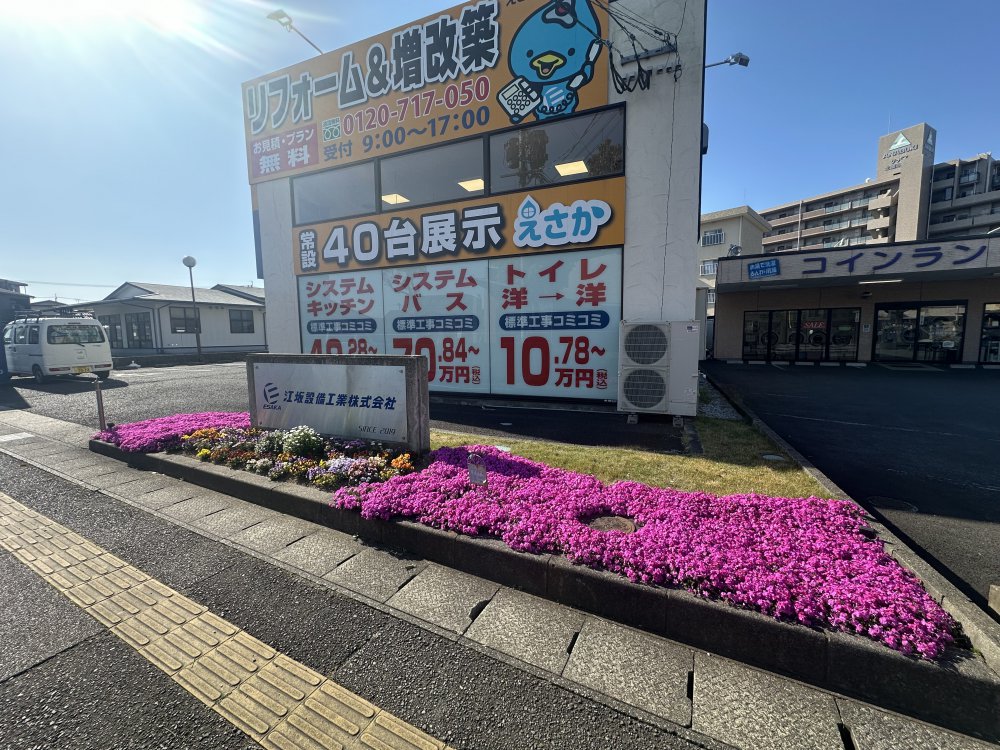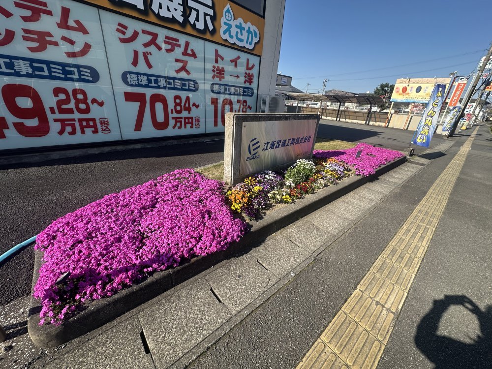 春の訪れとともに、リフォーム&増改築えさかのショールーム花壇が鮮やかなピンク色に染まりました!