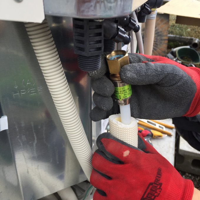 閉まっている(ハンドルが配管と直角)場合は、開けて(配管と平行に)ください。