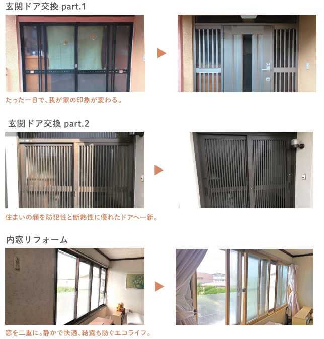 玄関・窓: たった1日で施工可能な玄関ドア交換や、断熱・防音・結露対策に絶大な効果を発揮する「内窓リフォーム」は、補助金が使える場合もあり、非常におすすめです。台風対策もお任せください。
