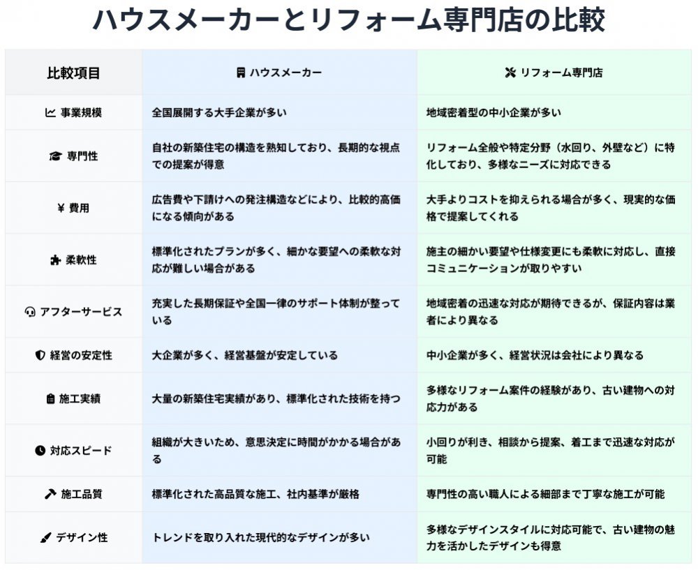 どちらが優れているかではなく、あなたの「リフォームの目的」「家の状況」「予算」「何を重視するか」によって、選ぶべきパートナーは決まります。