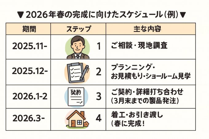 このチャンスを掴むには、2026年3月末までのご発注(ご契約)が必須です。 ご相談から発注までは数ヶ月かかります。まさに今(11月~12月)がご相談のベストタイミングです。
