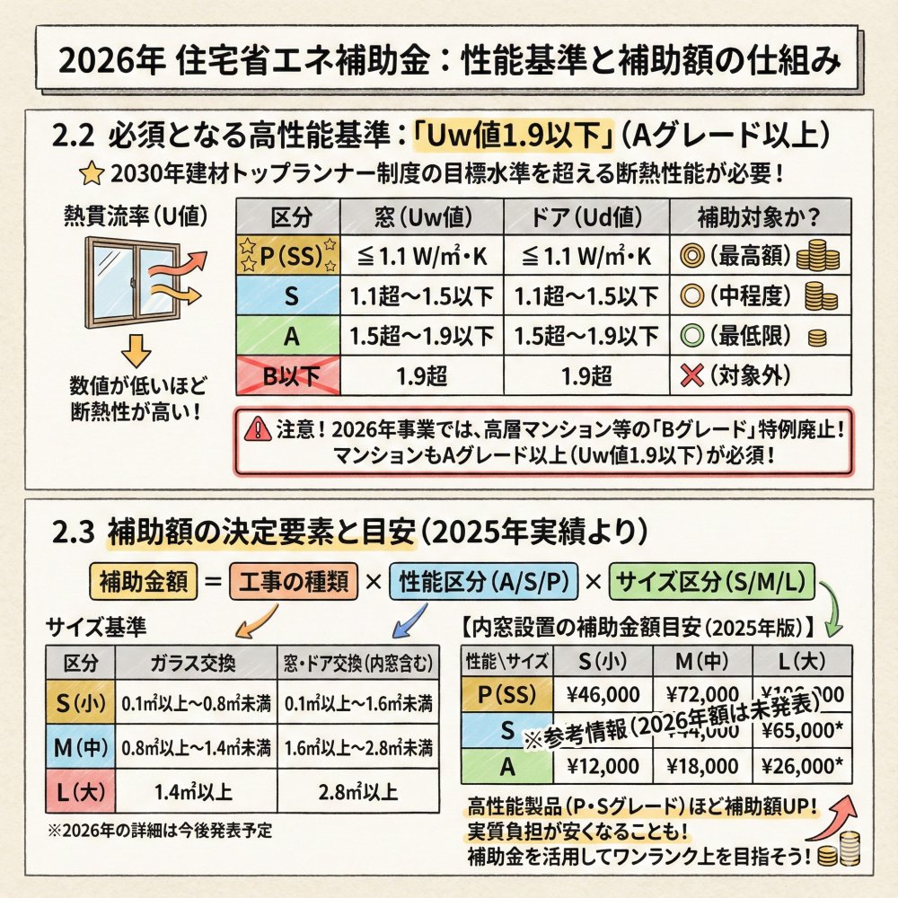 補助額は「工事種類 × 性能グレード × サイズ」で決定されます。