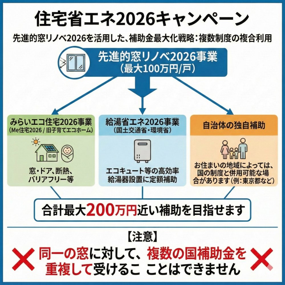 「住宅省エネ2026キャンペーン」の他事業と組み合わせることで、窓リノベの上限(100万円)以上の支援を目指せます。