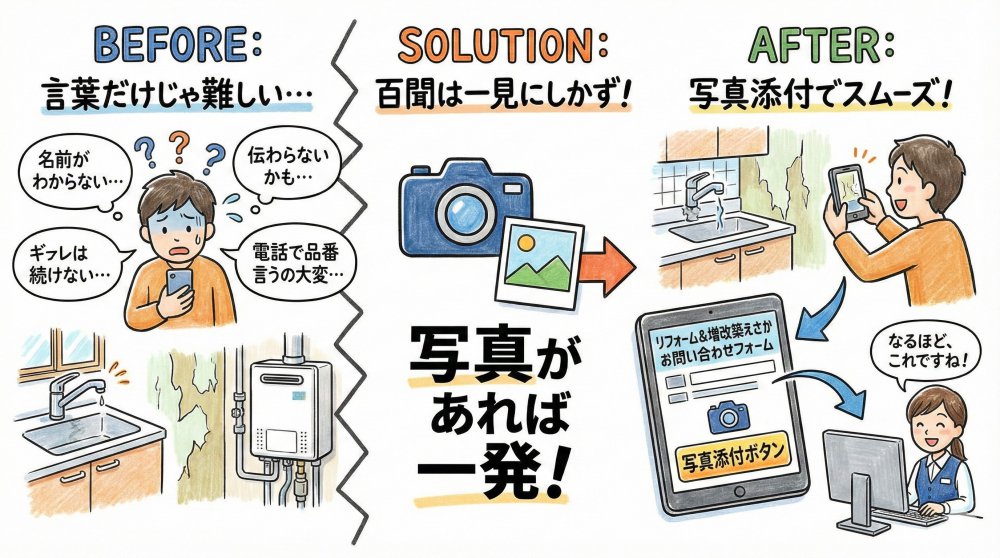 スマホでパシャッと撮って送るだけで、リフォームのプロが親身に対応させていただきます。