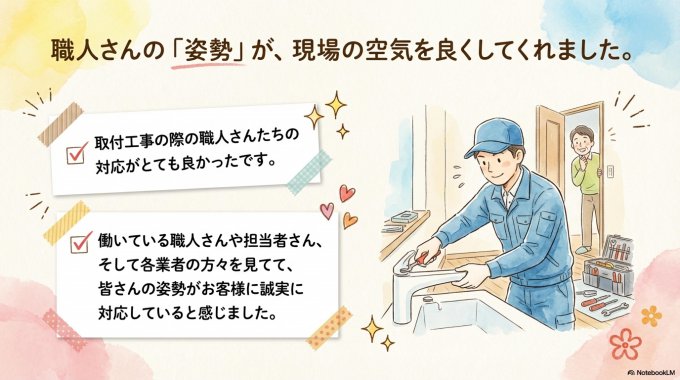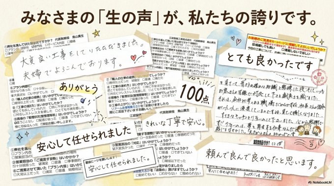 中には、さらなる改善を求める貴重なご指摘もありました。それら一つひとつを真摯に受け止め、施工体制の強化やアフターフォローの充実に繋げていくことをお約束いたします。