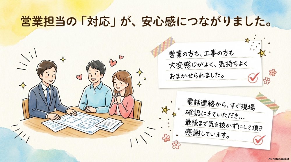 2025年にいただいた多くの声の中で、特に私たちが励みになったのは、スタッフの姿勢に対する温かいお言葉です。多くのお客様が、営業担当者の「提案する姿勢」に対し、