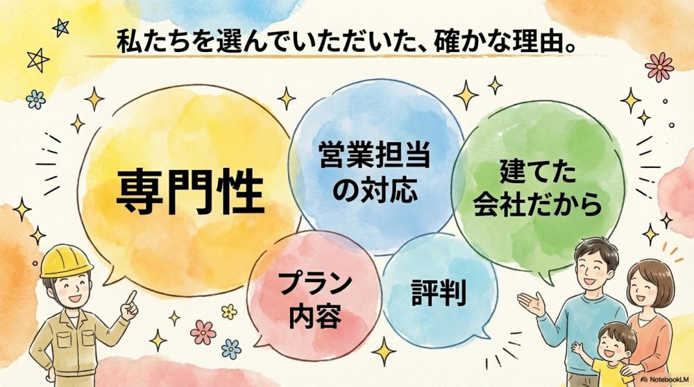 具体的には、「当初の相談から、要望に真摯に向き合ってくれた」、「メリットだけでなくデメリットまで説明してくれたので納得できた」、「儲け主義の営業トークではなく、本当にお客様のことを考えたアドバイスをくれた」 といったお声をいただいております。