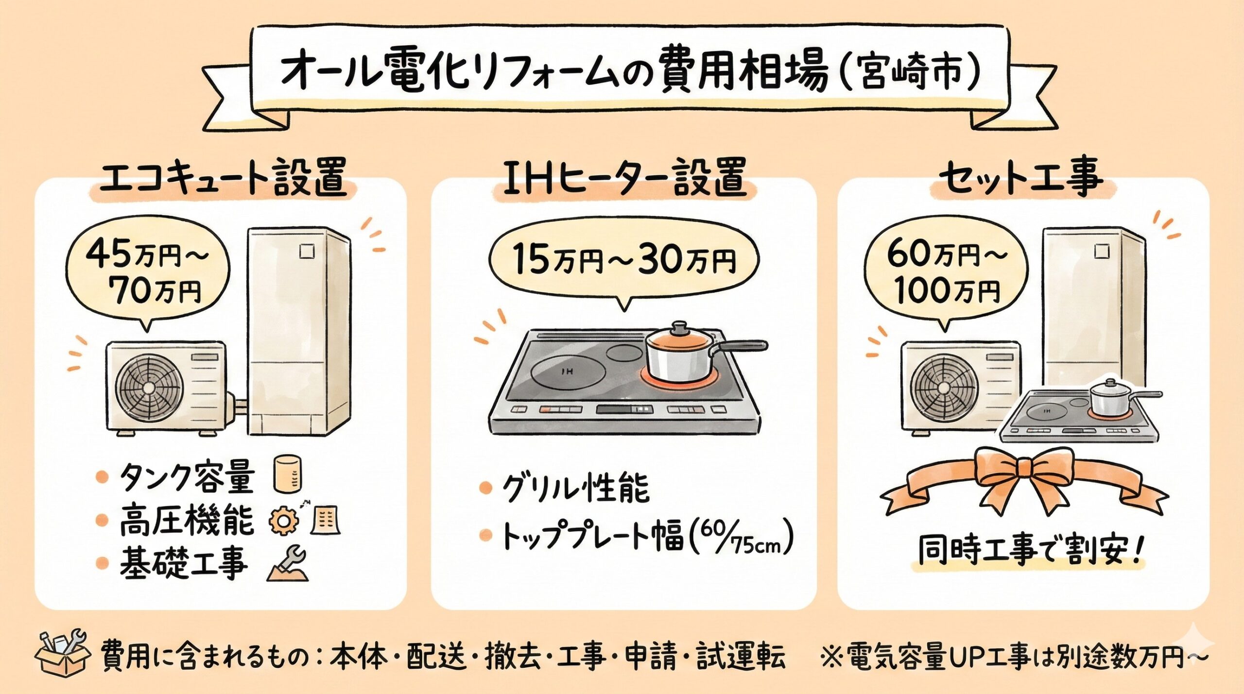 オール電化リフォームの満足度を左右するのは「機器選び」です。メーカーカタログを見ても専門用語ばかりで分からない…という方のために、宮崎市のライフスタイルに合わせた選び方を解説します。