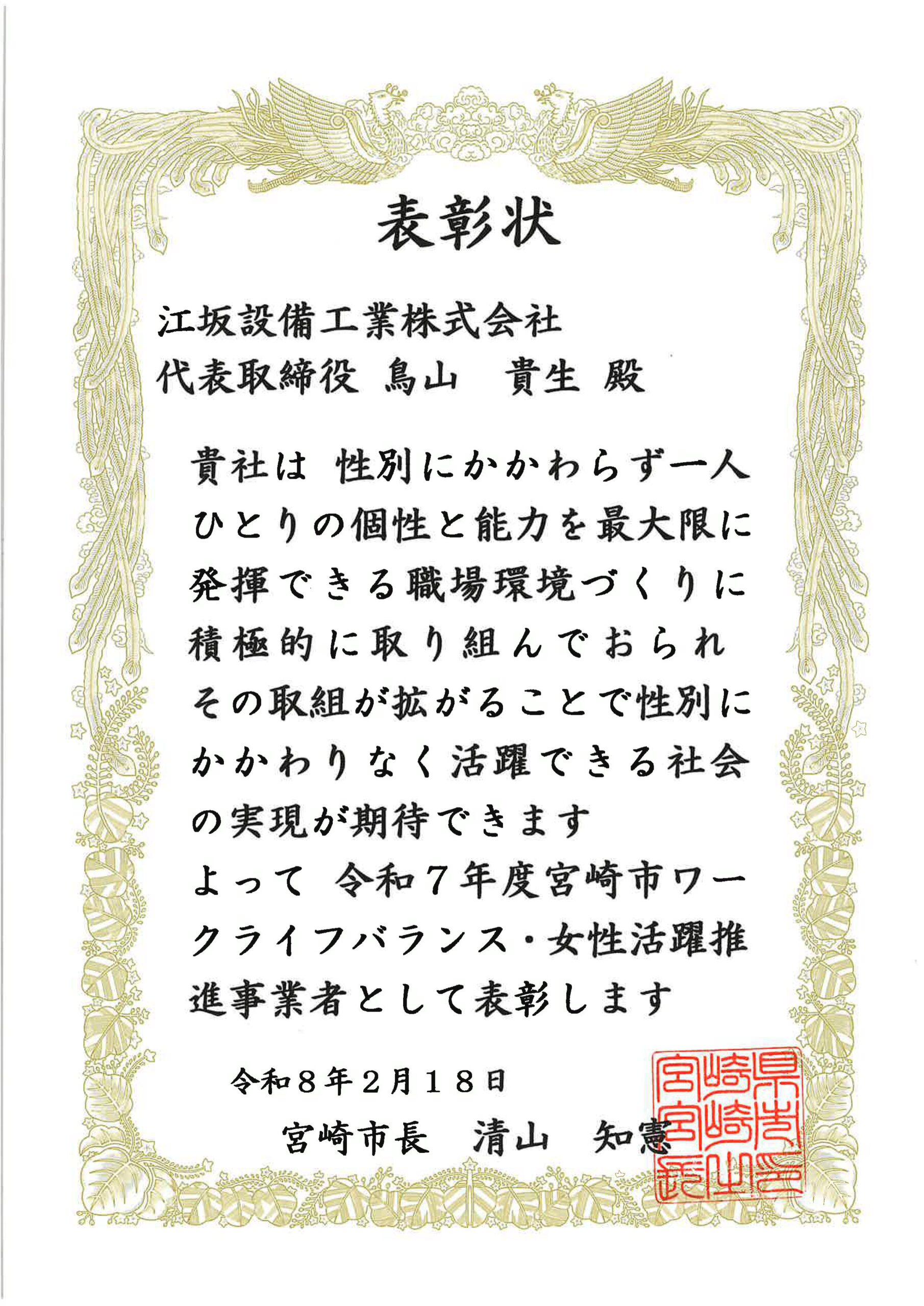 このたび、江坂設備工業株式会社は、宮崎市より「令和7年度 ワークライフバランス・女性活躍推進事業者」として表彰されましたことをご報告いたします。