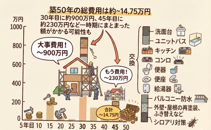 アットホームの調査でも、50年間を見据えると修繕費総額は約1,475万円に達すると示されています。