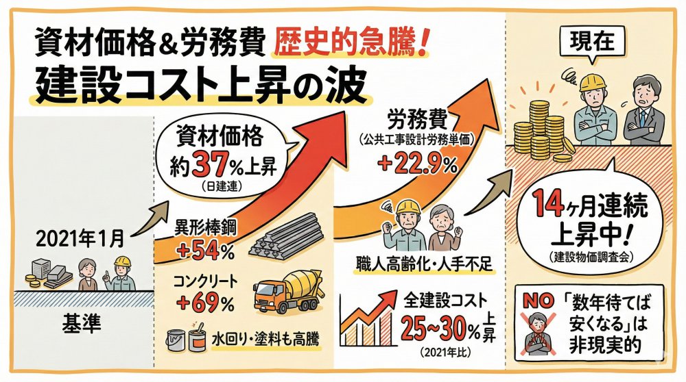 さらに、現場を支える職人の高齢化による深刻な人手不足から、公共工事設計労務単価も2021年比で22.9%引き上げられました。建設物価調査会(2026年1月速報)でも14か月連続の上昇が示されており、2021年比で全建設コストは26〜30%も上昇しています。「数年待てば安くなるだろう」という期待は現時点では現実的ではありません。