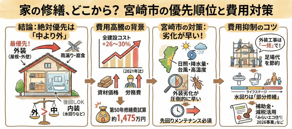 本記事では、建築業界の最新データと宮崎市の過酷な気候特性を踏まえ、家計への負担を極力抑えるための具体的かつ実践的な修繕戦略を徹底解説します。