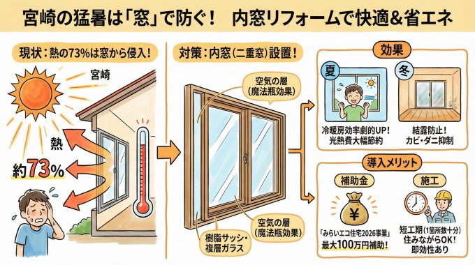 宮崎市の過酷な夏の暑さを乗り切る上で、熱の出入り口である「窓」の対策は非常に効果的です。夏の冷房時に外から入り込む熱の約73%は窓から侵入しています。