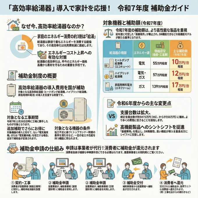 今回から補助の要件が少し変わり、単に省エネなだけでなく、インターネットに接続して遠隔操作ができたり、太陽光発電の余った電気を活用して昼間にお湯を沸かしたりできる「高機能・高効率な給湯器」への支援が強化されました。