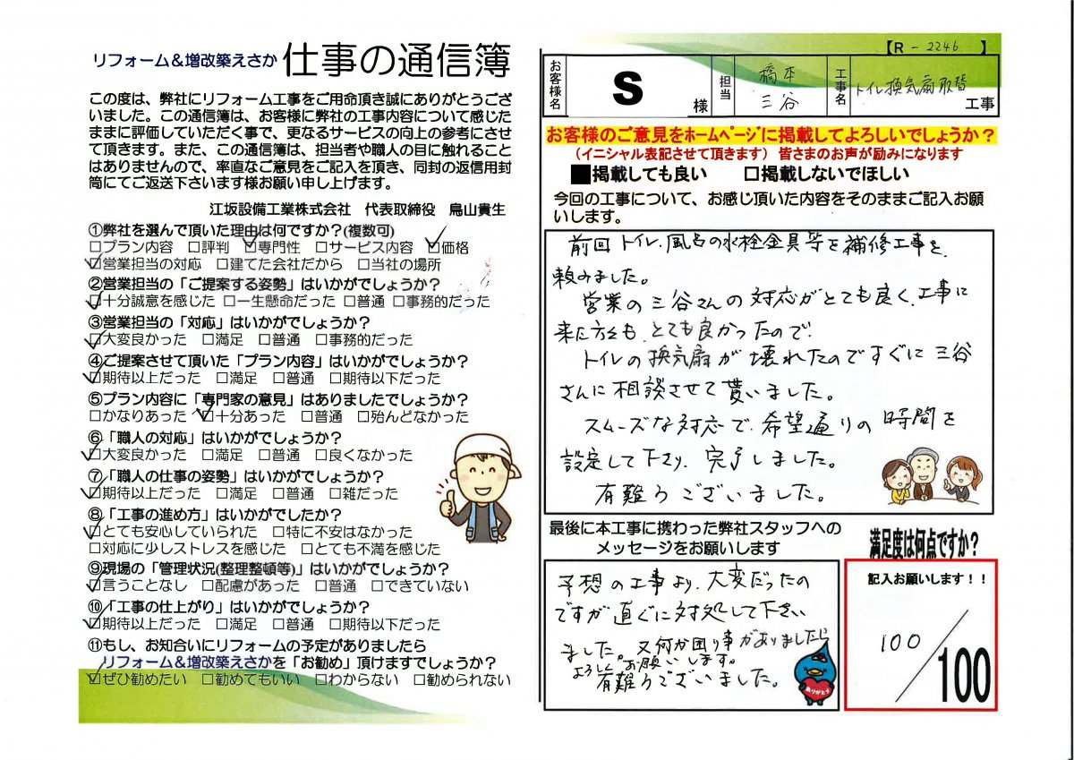 「またお願いします」という温かいお言葉を励みに、今後もS様の快適な暮らしをサポートいたします。またのご相談を心よりお待ちしております。