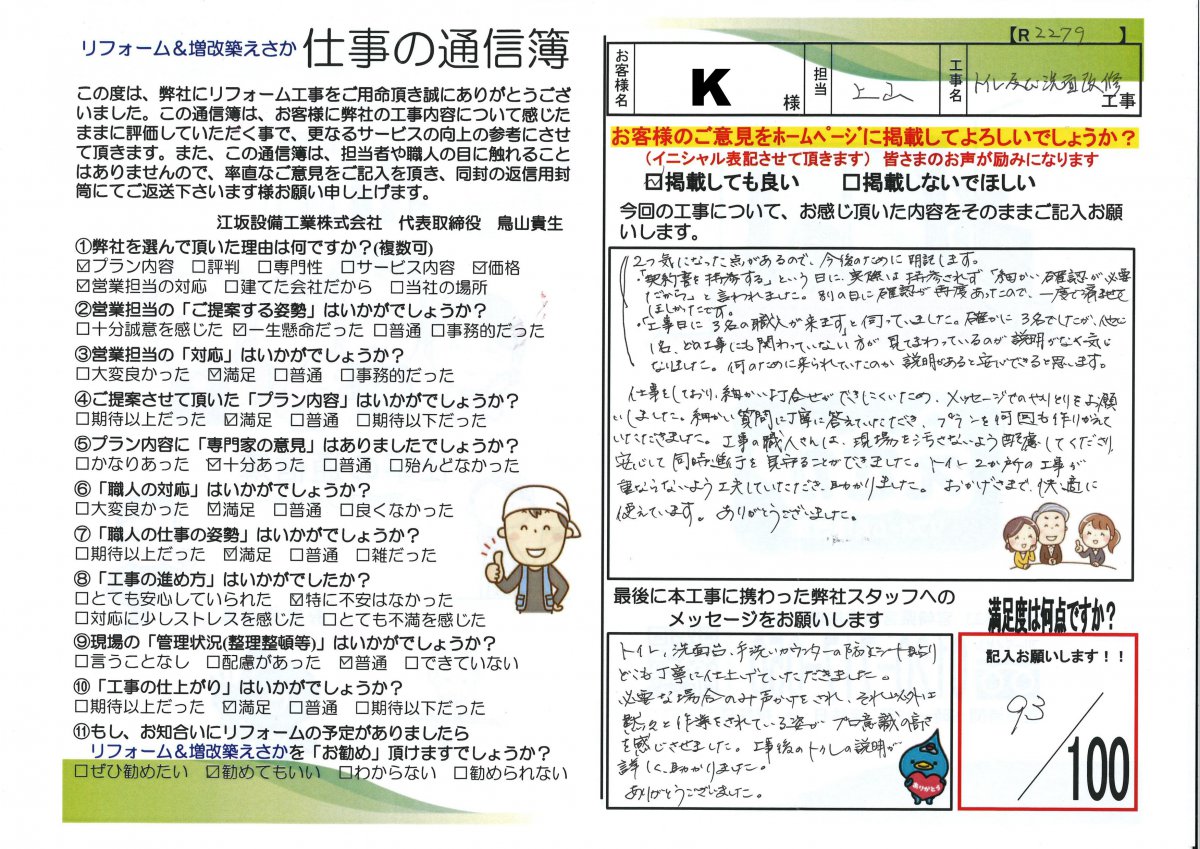 「他で工事等があれば」との温かいお言葉は、私共にとって何よりの励みとなります。 今後もお住まいのことでお困りの際は、ぜひお気軽にお声がけください。K様のまたのご利用をお待ちしております。