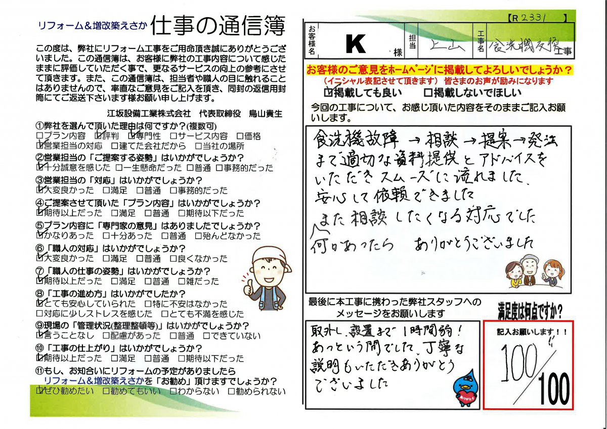 宮崎県宮崎市|K様邸食洗機取替工事【R2331】